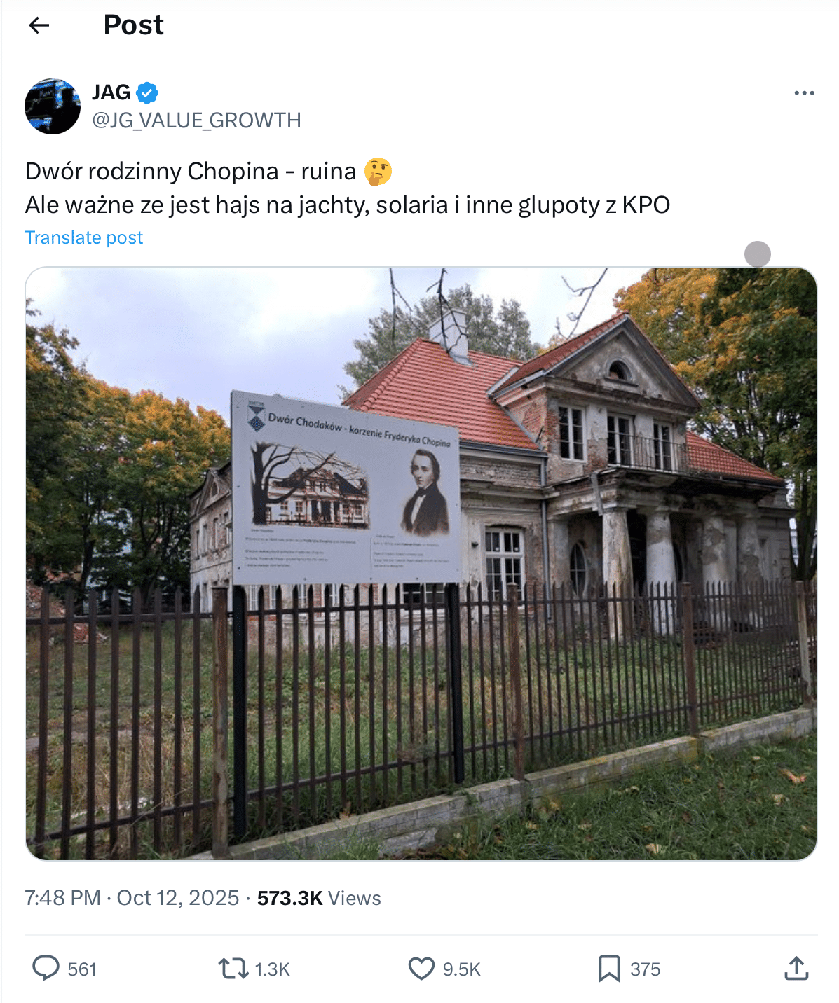 „Dwór rodzinny Chopina - ruina. Ale ważne, że jest hajs na jachty, solaria i inne głupoty z KPO” – napisano w poście opublikowanym 12 października 2025 roku na platformie X. Autor zamieścił w nim zdjęcie zniszczonego budynku, przed którym widać ogrodzenie z tablicą informacyjną przedstawiającą Fryderyka Chopina.