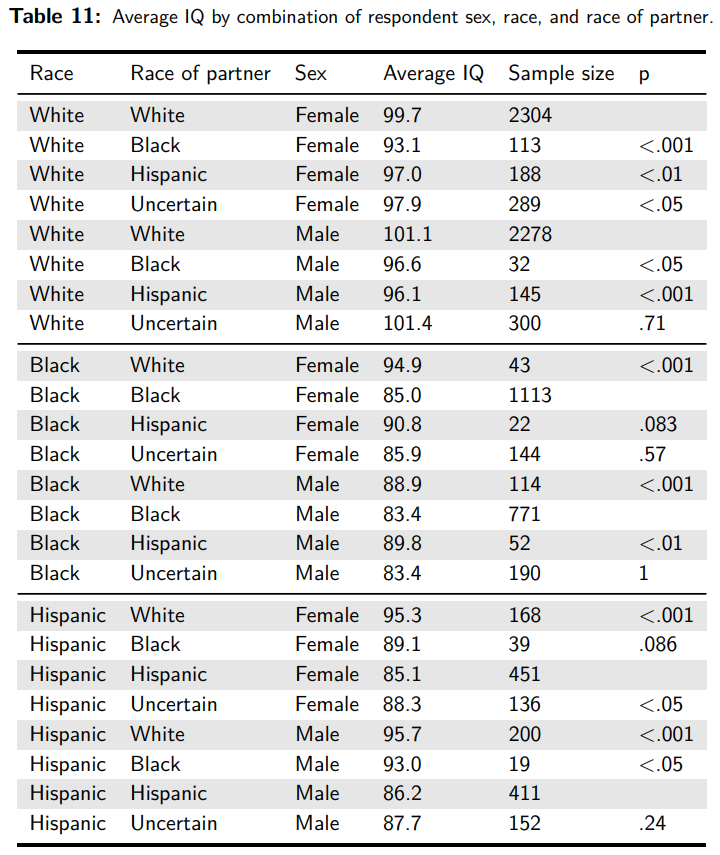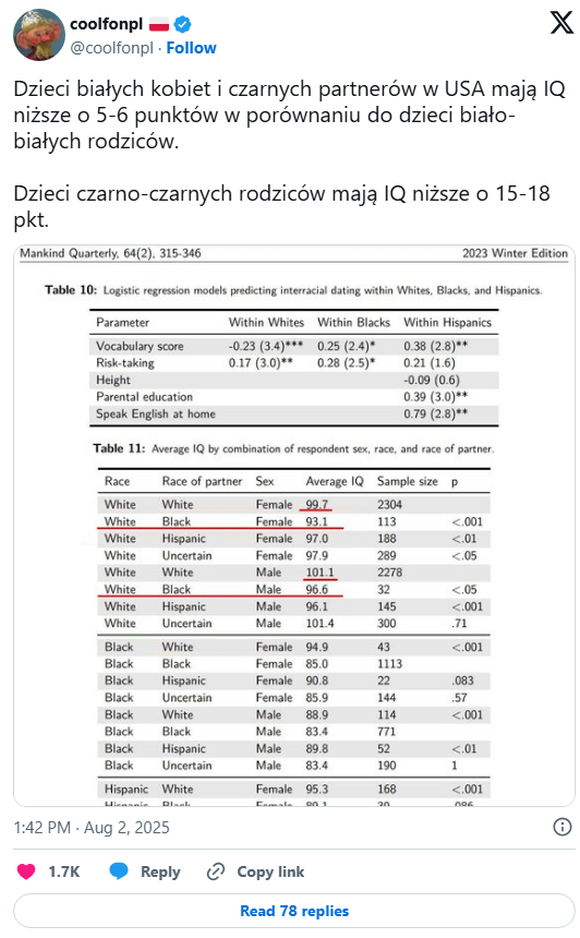 Na potwierdzenie wiarygodności powyższych słów ich autor – stały bohater naszych fact-checkingowych artykułów – zamieścił zrzut ekranu dwóch tabel podsumowujących wyniki pewnych badań. Pierwszą z nich zatytułowano Logistic regression models predicting interracial dating within Whites, Blacks and Hispanics (pol. Modele regresji logistycznej przewidujące randki międzyrasowe wśród białych, czarnych i Latynosów). Druga, w której autor podkreślił niektóre dane, sugerując, że właśnie na nich oparł swoje twierdzenia, nosiła tytuł Average IQ by combination of respondent sex, race, and race of partner (pol. Średnie IQ według kombinacji płci respondenta, rasy oraz rasy partnera).