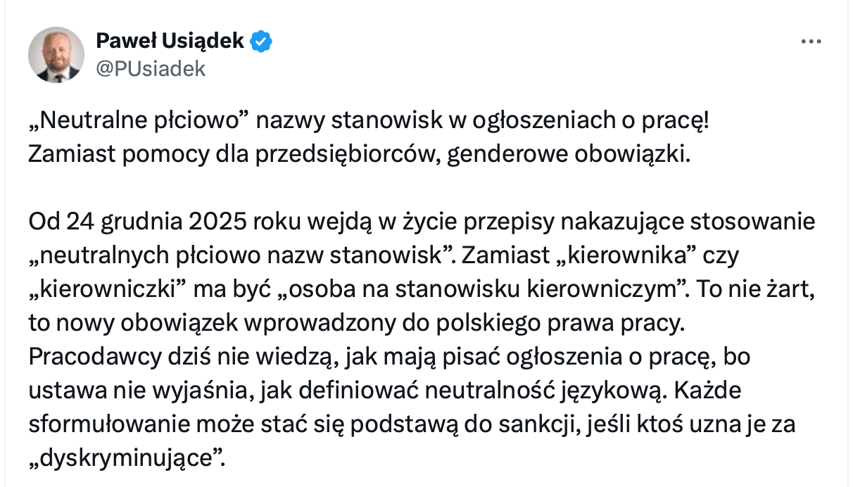 „Od 24 grudnia 2025 roku wejdą w życie przepisy nakazujące stosowanie «neutralnych płciowo nazw stanowisk». Zamiast «kierownika» czy «kierowniczki» ma być «osoba na stanowisku kierowniczym». To nie żart, to nowy obowiązek wprowadzony do polskiego prawa pracy” – alarmował w październiku Paweł Usiądek. Informacja ta była wielokrotnie podawana w mediach społecznościowych. W sieci pojawiały się nawet sugestie, że wkrótce zobaczymy takie określenia jak „osoba posłana” czy „księgowiszcze”.