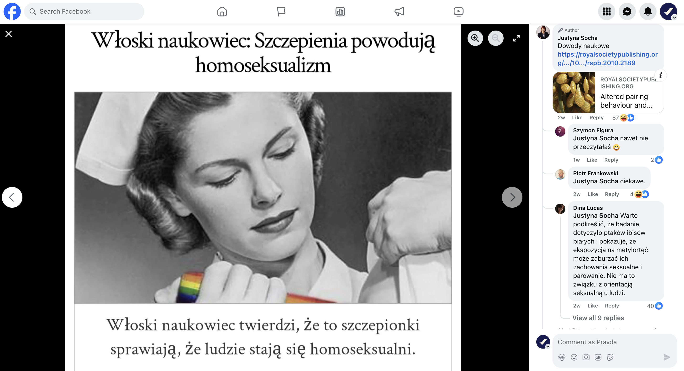 Na Facebooku i innych platformach wciąż pojawiają się treści sugerujące, że szczepienia mogą wpływać na orientację seksualną. Największy rozgłos zdobył post Justyny Sochy, znanej działaczki antyszczepionkowej. Powołuje się ona m.in. na badania naukowe i wypowiedzi osób przedstawianych przez nią jako eksperci. W rzeczywistości ani publikacje naukowe, ani środowisko medyczne nie dostarczają dowodów na istnienie jakiegokolwiek związku między szczepieniami a homoseksualnością.