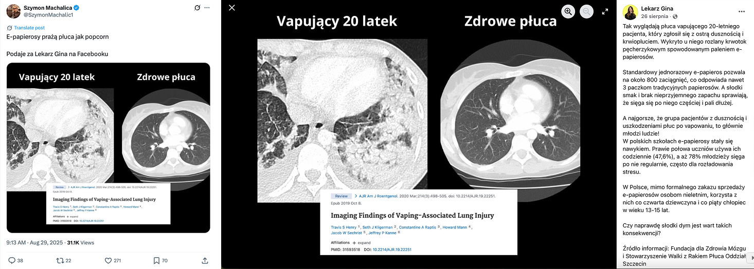 Wspomniane wpisy w mediach społecznościowych odwołują się do artykułu Imaging Findings of Vaping-Associated Lung Injury, w którym analizowane są obrazy rentgenowskie (RTG) i obrazy tomograficzne (TK) płuc pacjentów, którzy zgłaszali różne dolegliwości układu oddechowego i w wywiadzie medycznym deklarowali, że używają jakiejś formy e-papierosów.