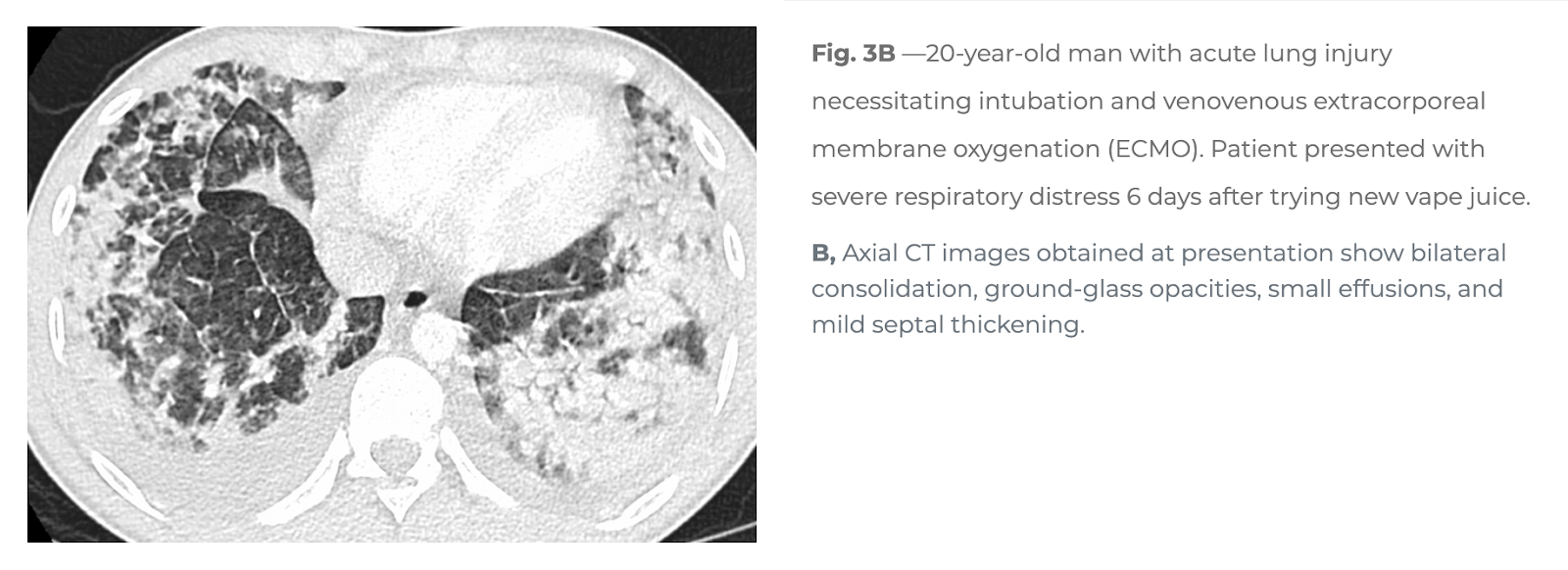 Zdjęcie, które widzimy w obu postach, to obraz tomograficzny klatki piersiowej wykonany przy przyjęciu 20-letniego pacjenta z ostrym uszkodzeniem płuc, które wymagało intubacji i zastosowania pozaustrojowego utlenowania krwi (ECMO). Według opisu pacjent trafił do szpitala z ciężką niewydolnością oddechową, która pojawiła się 6 dni po wypróbowaniu nowego roztworu inhalacyjnego do e-papierosa.