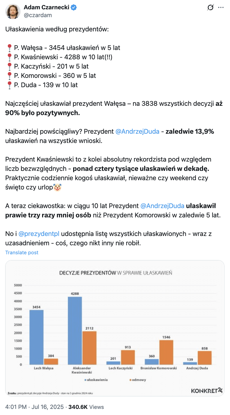 W jednym z popularniejszych wpisów użytkownik Adam Czarnecki pisze: „Najczęściej ułaskawiał prezydent Wałęsa – na 3838 wszystkich decyzji aż 90% było pozytywnych. Najbardziej powściągliwy? Prezydent @AndrzejDuda – zaledwie 13,9% ułaskawień na wszystkie wnioski”. W związku z końcem kadencji obecnie urzędującego Prezydenta postanowiliśmy przyjrzeć się liczbom ułaskawień i sprawdzić, czy faktycznie Prezydent Duda najrzadziej korzystał z prawa łaski.